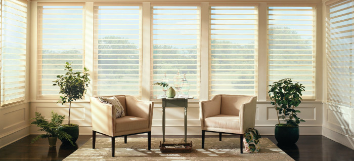 Innovative Sheers & Shadings by Hunter Douglas beautifully diffuse and soften natural light deep into a room. Easily adjust the vanes to suit your desired level of privacy and light control while maintaining UV protection.
